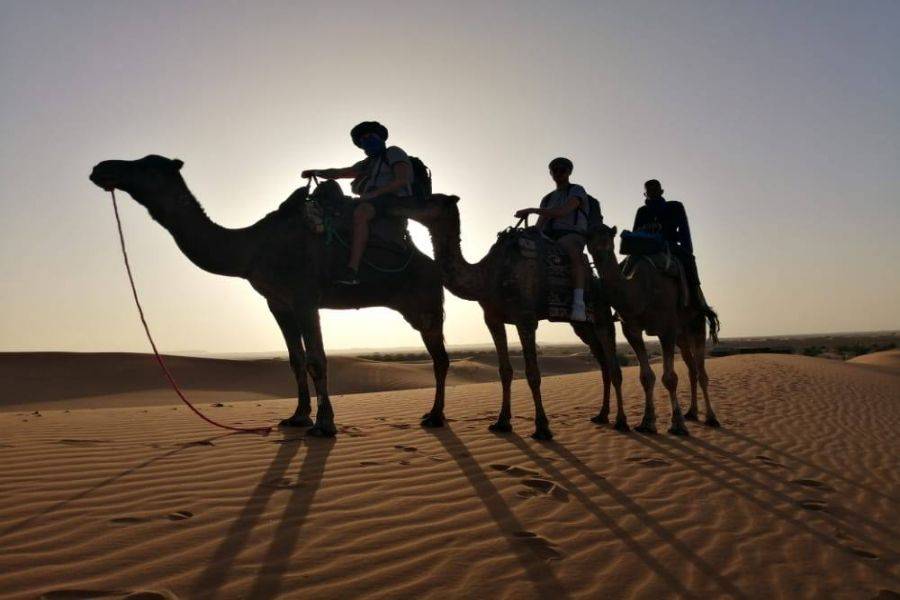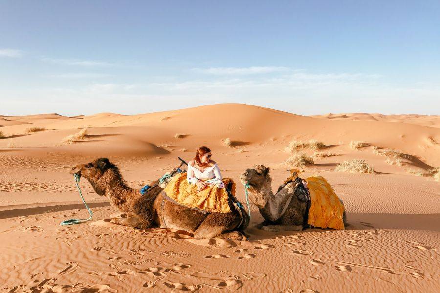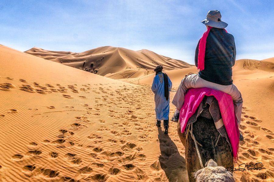 Leaving Errachidia and passing through a fascinating landscape, we will be passing by wide earth and splendid road with plenty of Oasis palms. Passing by Aoufouss then Erfoud to see the different type of mountains which looks very different from what mountains you have seen in Morocco. We will reach Errissani, a beautiful and welcoming city where we will be visiting Moulay Ali Cherif, which is a mausoleum with a calm and beautiful garden. Our last stop on the first day will be Merzouga, ride a camel to head it to the dunes of Erg Chebbi and meet the local Nomads with a great welcoming, enjoy the night with beautiful scenery of traditional nomad instruments and dancing. Then have a wonderful night stay under the dark blue sky in the wide Moroccan desert.
