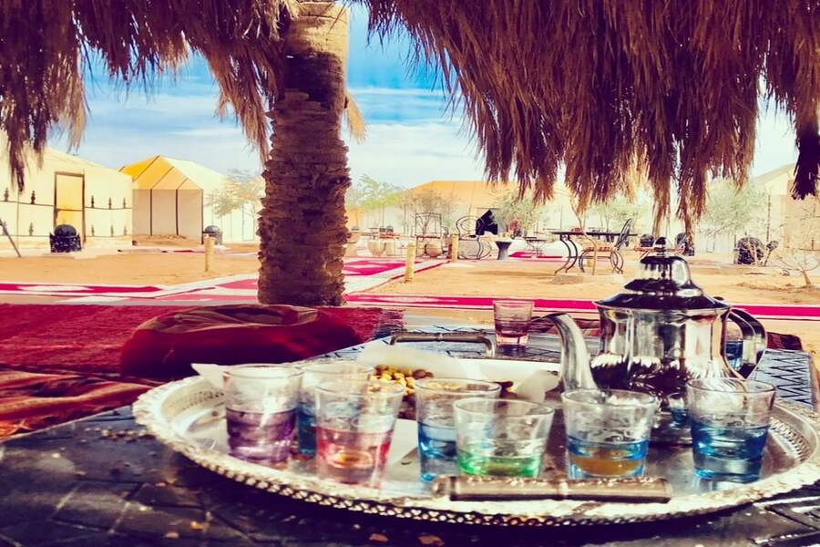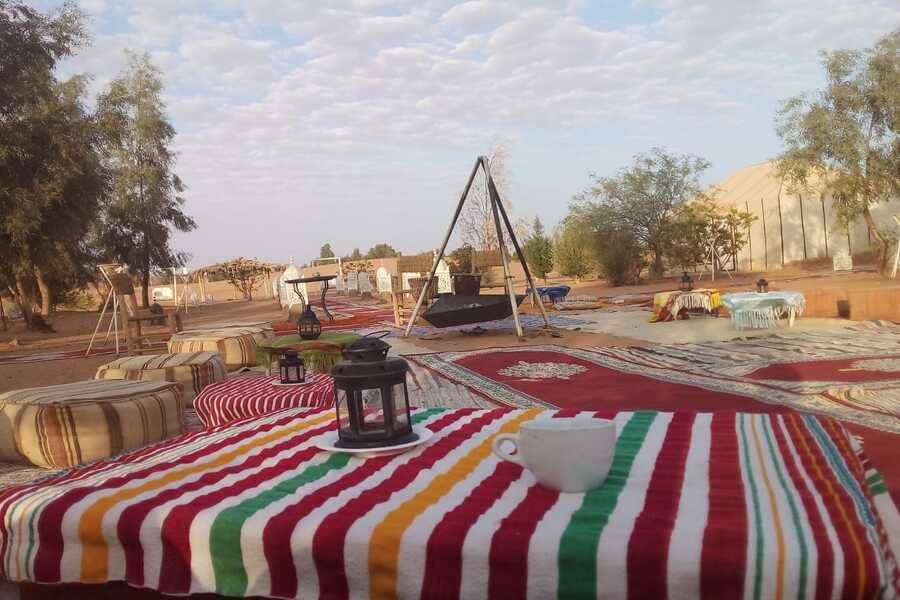 Upon arrival at Des dunes lodge, feel free to take a swim at their freshening pool before getting ready for your sunset desert trek to the camp.