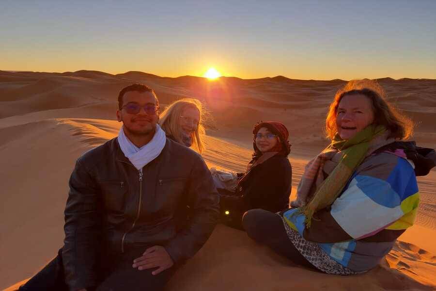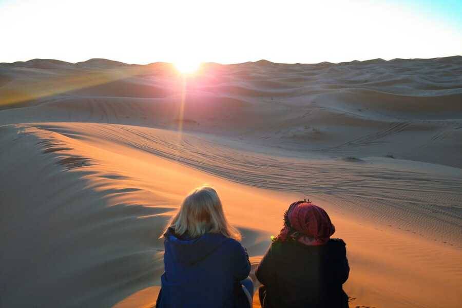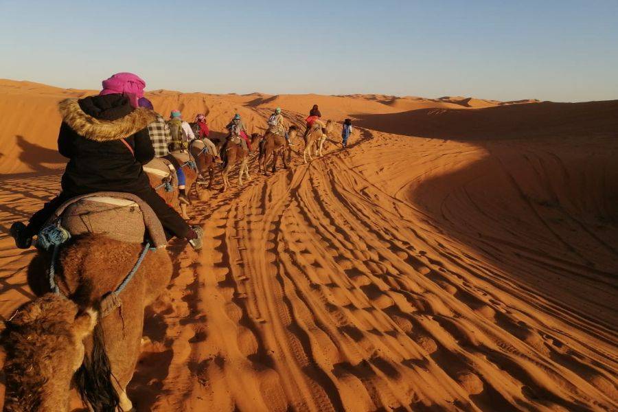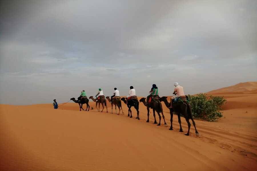 The 4 days Marrakech desert tour from Marrakech to Merzouga dunes & Ouarzazate will make you explore the majestic Morocco Sahara desert in 4 days to follow the paths of the old caravan roads while driving past Dades Valley with its oases dotted with dates palm trees and fortified Kasbahs. you will cross the volcanic massif of the Anti Atlas Mountains, ride your camel in Erg Chebbi, Sleep under the stars at your Morocco Sahara desert camp in Merzouga, cross the Valley of the roses and the road of 1001 Kasbahs. Finally, admire the splendid Kasbah of Ait Ben Haddou!